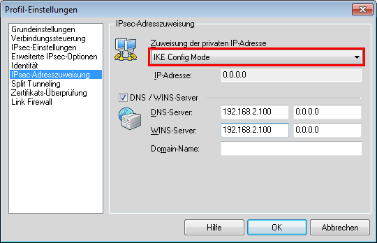 - Verwenden Sie bei der IP-Adress-Zuweisung den 'IKE Config Mode'.