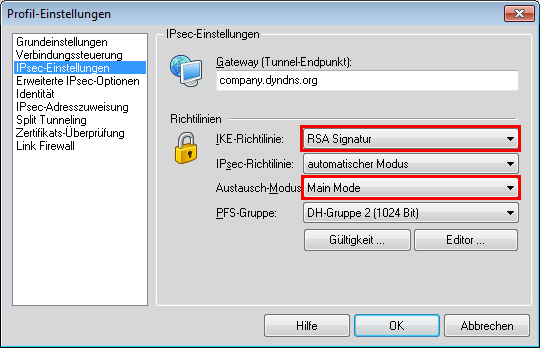 - Stellen Sie in den IPSec-Einstellungen des Profils die IKE-Richtlinie auf 'RSA-Signatur' um.