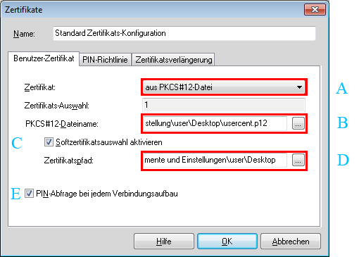 - Wählen Sie als Zertifikatetyp die 'PKCS#12-Datei aus und geben Sie die gewünschte Zertifikatsdatei an.
