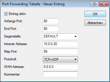 Bei der Konfiguration des Port-Mappings wird einem Port oder Portbereich (Anfangs-Port bis End-Port) eine IP-Adresse aus dem LAN als Ziel und der im LAN zu verwendende Port (Map-Port) zugewiesen.