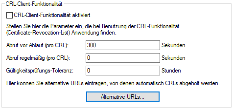 Die Adresse, von der eine Certificate Revocation List (CRL) abgeholt werden kann, wird normalerweise innerhalb der Zertifikate (als crlDistributionPoint) angegeben. Bei der Konfiguration der CRL-Funktion können zusätzliche Parameter wie das Update-Intervall angegeben werden.