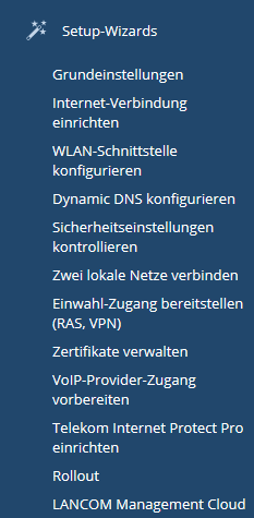 Mit den Setup-Wizards haben Sie die Möglichkeit, schnell und komfortabel häufige Einstellungen für ein Gerät vorzunehmen. Wählen Sie dazu den gewünschten Assistenten aus und geben Sie auf den folgenden Seiten die benötigten Daten ein. Die einzelnen Einrichtungsschritte sind mit denen von LANconfig identisch.