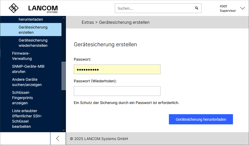 Unter bzw. können Sie wichtige Dateien in einer mit einem Passwort geschützten ZIP-Datei sichern. Diese Datei können Sie zu einem späteren Zeitpunkt zur Wiederherstellung wieder in das Gerät hochladen.