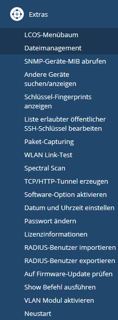 Im Menübereich Extras finden Sie einige Funktionen, welche die Konfiguration der Geräte erleichtern; je nach Gerät aber auch einige Sonderfunktionen und spezielle Analysemodule bereitstellen, die sich keinem der bisherigen Menüpunkte sinnvoll zuordnen lassen.