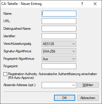 - Anhand der hier eingetragenen Prüfsumme (Fingerprint) kann die Authentizität des erhaltenen CA-Zertifikates überprüft werden (entsprechend des eingestellten CA-Fingerprintalgorithmus).