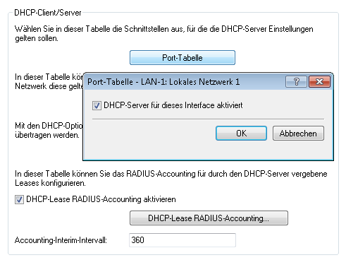 Die Aktivierung bzw. Deaktivierung des DHCP-Servers ist für jedes logische Interface (z. B. LAN-1, WLAN-1, P2P-1-1 etc.) separat möglich. Wählen Sie dazu im Konfigurationsmenü unter IPv4 > DHCPv4 > Port-Tabelle das entsprechende logische Interface aus und schalten Sie den DHCP-Server für dieses Interface ein oder aus.
