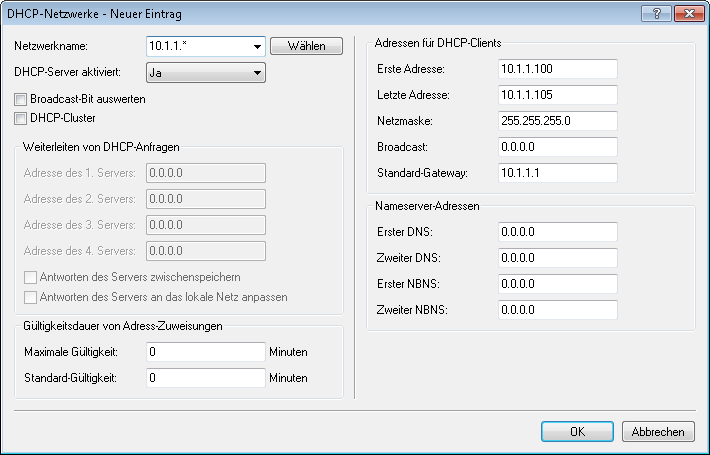 Wenn das gleiche Netz von mehreren Relay-Agents verwendet wird (z. B. mehrere Access Points leiten die Anfragen auf einen zentralen DHCP-Server weiter), dann kann die GI-Adresse auch mit einem "*" abgekürzt werden. Wenn z. B. Clients im entfernten Netz 10.1.1.0/255.255.255.0 Adressen zugewiesen werden sollen und in diesem Netz mehrere Relay-Agents stehen, die alle das Gerät als übergeordneten DHCP-Server verwenden, dann kann die Zuweisung von IP-Adressen und Standard-Gateway an die Clients so erfolgen: