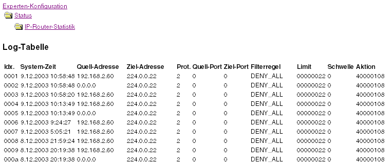 Wird die Logging-Tabelle über WEBconfig aufgerufen, präsentiert sie sich in folgender Darstellung: