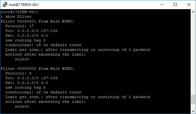 Auf der Kommandozeile können die konfigurierten Filter mit dem Kommando show filter angezeigt werden: