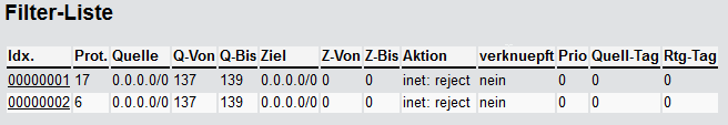Unter WEBconfig rufen Sie die Filterliste unter auf Sie hat den folgenden Aufbau: