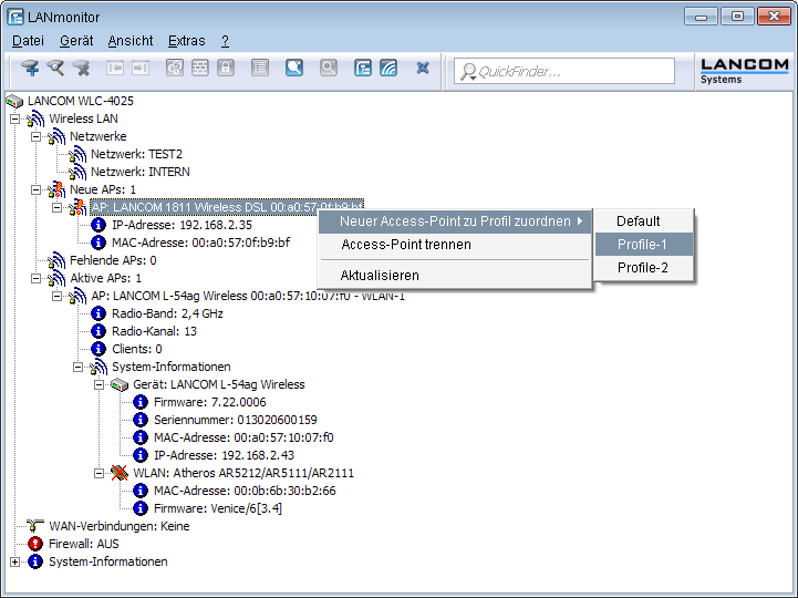 Klicken Sie dazu im LANmonitor mit der rechten Maustaste auf den neuen AP, den Sie in die WLAN-Struktur aufnehmen möchten. Wählen Sie dann im Kontextmenü die Konfiguration, die Sie dem Gerät zuordnen wollen.