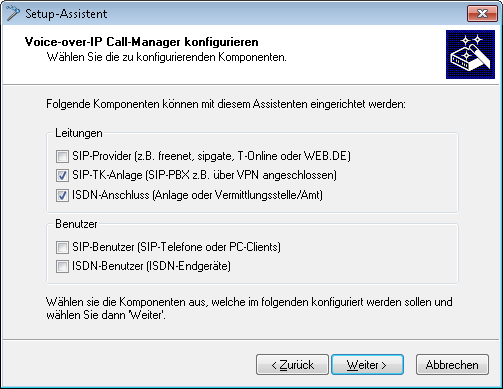 - Führen Sie unter LANconfig den Setup-Assistenten zur Konfiguration des Voice-Call-Managers aus. Aktivieren Sie die Optionen SIP-TK-Anlage und ISDN-Anschluss.