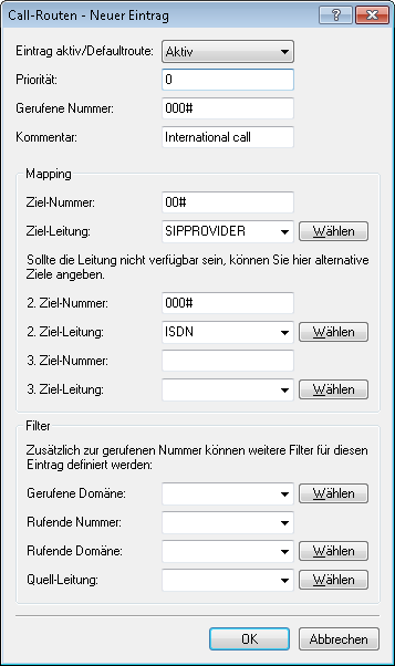 - Passen Sie die vorgeschlagene Call-Routing-Tabelle an, um spezielle Rufnummern-Ziele automatisch über die Leitung des SIP-Providers zu führen. Das folgende Beispiel zeigt den Eintrag für die Auslandsgespräche.