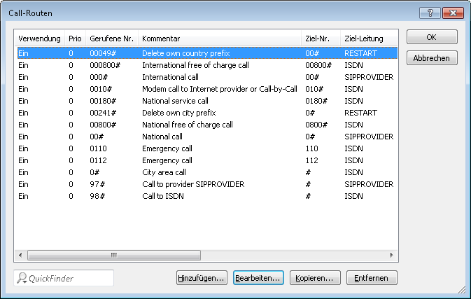 - Nach der Anpassung sieht die Call-Routing-Tabelle dann z. B. so aus: