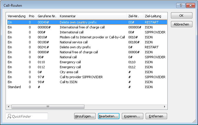 - Damit die ISDN-Teilnehmer intern von den VoIP-Benutern erreicht werden können, wird zusätzlich eine Standardroute eingerichtet, die alle vorher nicht aufgelösten Rufe ohne Veränderung der Rufnummer auf der ISDN-Leitung ausgibt. Nach der Anpassung sieht die Call-Routing-Tabelle dann z. B. so aus: