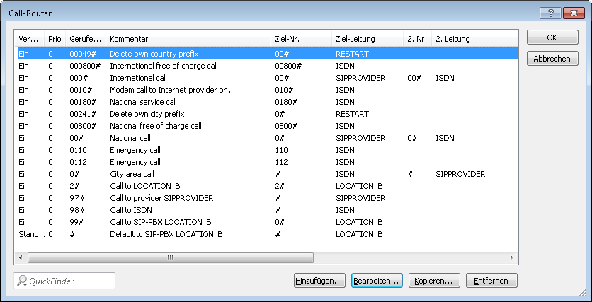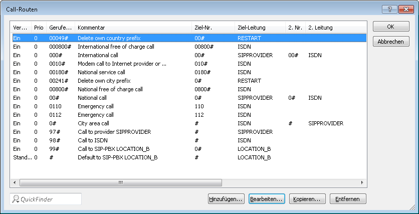 Nach der Anpassung für internationale und nationale Ferngespräche sieht die Call-Routing-Tabelle dann z. B. so aus: