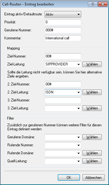 - Passen Sie die vorgeschlagene Call-Routing-Tabelle an, um internationale und nationale Ferngespräche über die Leitung des SIP-Providers mit Backup über ISDN auszuführen. Beachten Sie dabei, dass die führende 0 aus der Rufnummer entfernt werden muss.