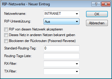 Meistens ist es nicht erwünscht, dass die lokale Netzstruktur über RIP in die DMZ propagiert wird. Außerdem ist es zwar manchmal erwünscht, in ein Netzwerk die bekannten Routen zwar zu propagieren, von dort aber keine Routen zu lernen (wie z. B. auch im WAN). Der RIP-Funktionalität kann daher für jedes Netzwerk getrennt eingestellt werden