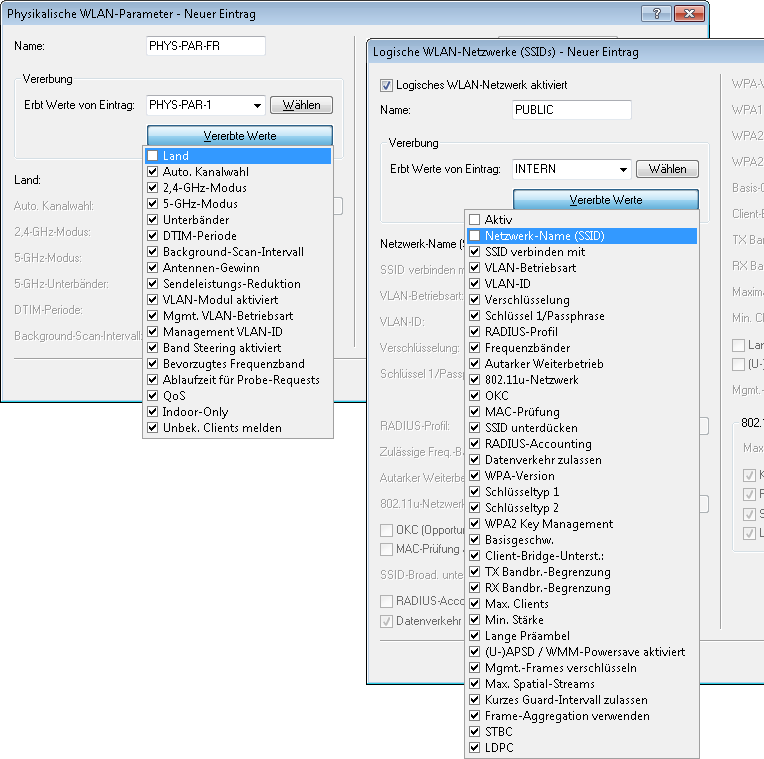 Damit auch in komplexen Anwendungen die WLAN-Parameter nicht in mehreren Profilen redundant je nach Land oder Gerätetyp gepflegt werden müssen, können die logischen WLAN-Netzwerke und die physikalischen WLAN-Parameter ausgewählte Eigenschaften von anderen Einträgen "erben".