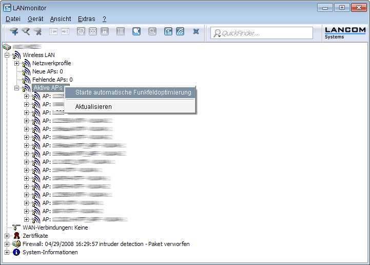 LANmonitor: Klicken Sie mit der rechten Maustaste auf die Liste der aktiven APs oder auf ein bestimmtes Gerät und wählen Sie danach im Kontextmenü Starte automatische Funkfeldoptimierung.