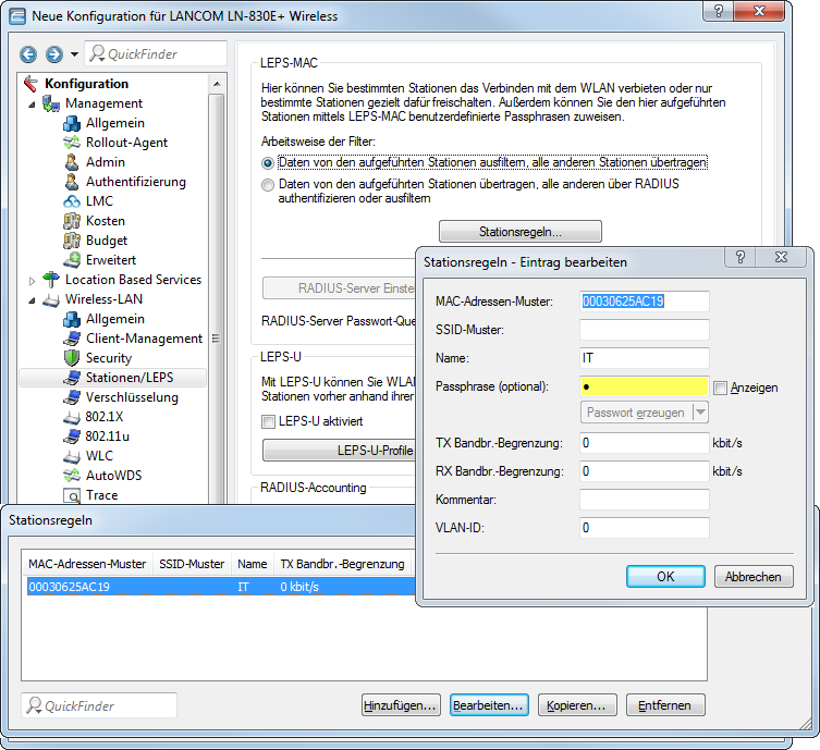 Bei der Konfiguration mit LANconfig geben Sie die Passphrases der im WLAN zugelassenen Stationen (MAC-Adressen) im Konfigurationsbereich 'Wireless-LAN' auf der Registerkarte 'Stationen' unter der Schaltfläche Stationen ein.