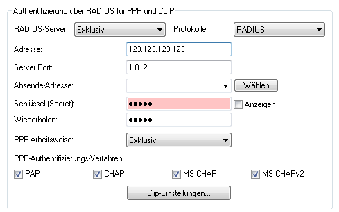 - Stellen Sie auch die PPP-Arbeitsweise auf “Exklusiv” ein, damit die eingehenden XAUTH-Anfragen ausschließlich über den RADIUS-Server authentifiziert werden.