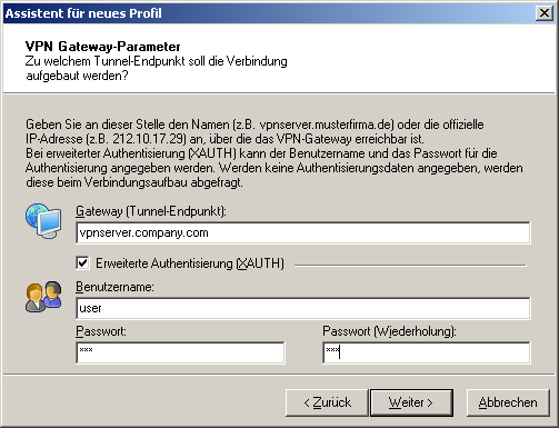 - Aktivieren Sie im VPN-Client der einwählenden Station die Verwendung von XAUTH. Tragen Sie als Benutzernamen und Kennwort die