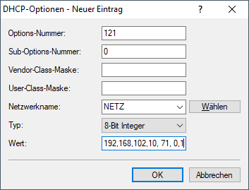 Beispiel: Option "Classless Static Route" im DHCP-Server übertragen