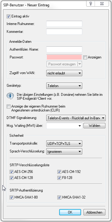 Normalerweise akzeptiert der SIP-Proxy Anmeldung von allen SIP-Benutzern, die sich mit einer gültigen Domain anmelden und als SIP-Benutzer im System bekannt sind. Wenn Sie unter im Abschnitt SIP-Benutzer die Option Lokale Authentifizierung erzwingen aktivieren, dann muss auch ein Passwort für den SIP-Benutzer eingetragen sein, das dann bei der Anmeldung überprüft wird.
