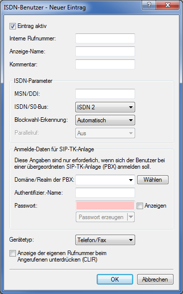 Anmerkung: Mit dem #-Zeichen als Platzhalter können Sie ganze Gruppen von Rufnummern erfassen, z. B. bei der Verwendung von Durchwahlnummern an einem Anlagenanschluss in einem einzigen Eintrag.Anmerkung: Sie können Benutzereinträge mit #-Zeichen zur Abbildung von Benutzergruppen nicht für eine Anmeldung an einer übergeordneten TK-Anlage verwenden. Für diese Anmeldung ist immer ein spezifischer Eintrag für den einzelnen ISDN-Benutzer notwendig. - ISDN/S0-Bus