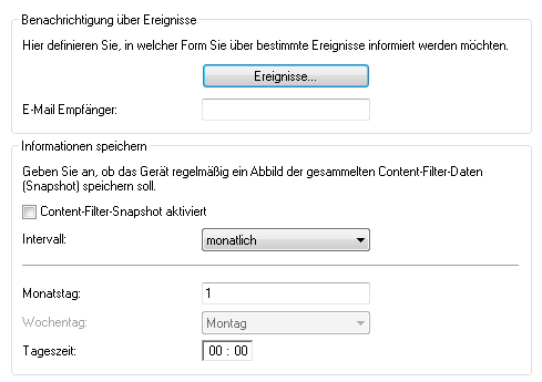 Unter können Sie einstellen, ob Sie über Ereignisse benachrichtigt werden und wo die Informationen des Content Filters gespeichert werden sollen.