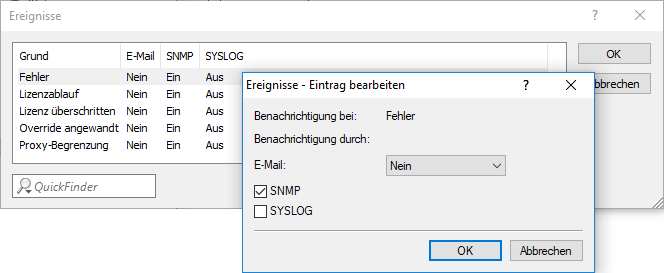 durch E‑Mail, SNMP oder SYSLOG. Für verschiedene Ereignisse kann separat definiert werden, ob und in welcher Menge Meldungen