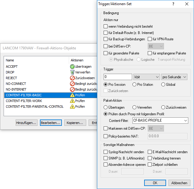 Eine Firewall-Regel für den Content Filter muss ein spezielles Aktionsobjekt verwenden, das über die Paket-Aktionen die Daten mit einem Content-Filter-Profil prüft. In der Default-Einstellung finden Sie die Aktionsobjekte CONTENT-FILTER-BASIC, CONTENT-FILTER-WORK und CONTENT-FILTER-PARENTAL-CONTROL, die auf jeweils passende Content-Filter-Profile zurückgreifen: