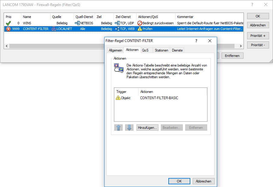 In der Default-Einstellung finden Sie die Firewall-Regel CONTENT-FILTER, die auf das Aktionsobjekt CONTENT-FILTER-BASIC zurückgreift: