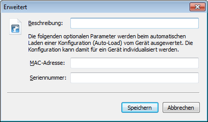 Um die erweiterten Meta-Daten in eine Konfigurationsdatei mit aufzunehmen, klicken Sie im Datei-speichern-Dialog von LANconfig auf die Schaltfläche Erweitert und geben die Daten – sofern nicht bereits vorausgefüllt – in die jeweiligen Felder ein.