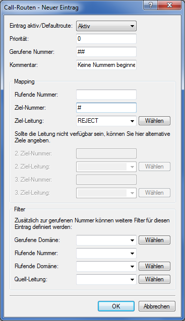Hier verhindern Sie, dass Steuercodes gewählt werden können. Über Steuercodes können z. B. Rufumleitungen konfiguriert werden. Dies können Sie für beliebige Leitungen bzw. Mitarbeiter unterbinden. Um beispielsweise das Zeichen '#' abzuweisen, gehen Sie wie folgt vor: