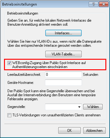 Der Zugriff aus einem Public Spot-Netzwerk auf die Konfiguration eines Public Spots (WEBconfig) sollte aus Sicherheitsgründen immer ausgeschlossen sein. Mit einem speziellen Schalter besteht die Möglichkeit, den Zugang über Public Spot-Interfaces auf die Public Spot-Authentisierungsseiten zu reduzieren und automatisch alle anderen Konfigurationsprotokolle zu sperren.