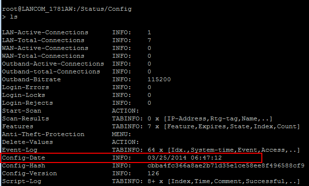 Ab LCOS-Version 9.10 haben Sie die Möglichkeit, über status/config/config-date das Datum und die Uhrzeit der Geräte-Konfiguration auszulesen.