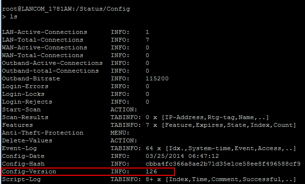 Ab LCOS-Version 9.10 haben Sie die Möglichkeit, über status/config/config-version die Versionsnummer der Geräte-Konfiguration auszulesen.