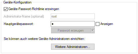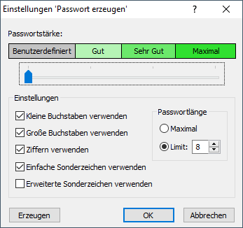 Stellen Sie mit dem Schieberegler die gewünschte Passwortstärke ein. In der Einstellung Benutzerdefiniert haben Sie die Möglichkeit, die maximale Passwortlänge und die erforderlichen Zeichentypen zu definieren. In den Einstellungen Gut, Sehr Gut und Maximal sind die Einstellungen mit sinnvollen, nicht veränderbaren Werten vorbelegt.