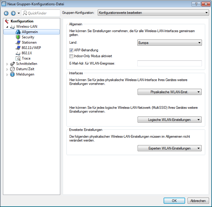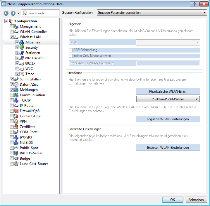 Voraussetzung für die Verwendung der Gruppen-Konfiguration ist die Gruppierung der Geräte in Ordnern. Diese LANconfig-Ordner enthalten die Geräte-Einträge, für die eine gemeinsame Konfiguration der Gruppen-Konfigurationsparameter sinnvoll ist, sowie einen Verweis auf die Gruppen-Konfiguration. Die nachfolgenden Handlungsschritte beschreiben, wie sie eine neue Gruppen-Konfiguration anlegen.