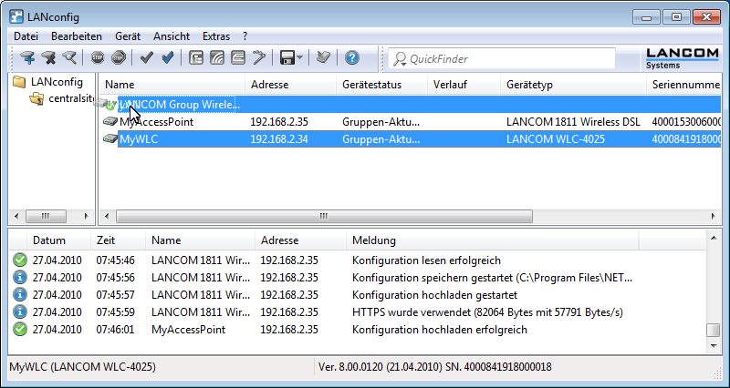 Beim folgenden Prüfen der Geräte wird LANconfig feststellen, dass die Konfigurationen der anderen Geräte im Ordner nicht mehr mit der neuen Gruppen-Konfiguration übereinstimmen und dies über den Gerätestatus entsprechend anzeigen.