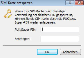 Wenn Sie dreimal den falschen PIN eingegeben haben, wird Ihre SIM-Karte gesperrt. Unter diesem Menüpunkt können Sie die SIM-Karte durch die Eingabe des PUK bzw. Super-PIN wieder entsperren.
