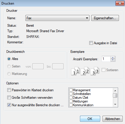 Zusätzlich zum normalen Druckdialog haben Sie im Abschnitt Optionen folgende Einstellungsmöglichkeiten: