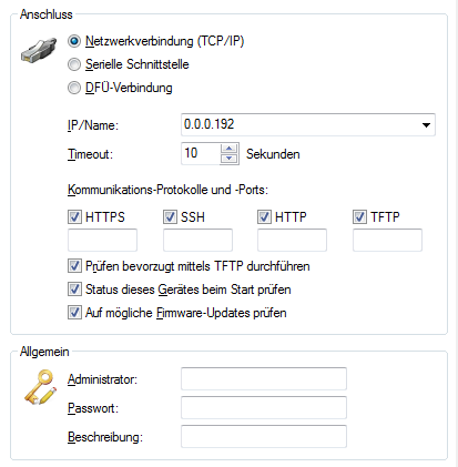 LANconfig führt sowohl die Prüfung der Geräte auf Erreichbarkeit als auch die Aktionen Firmware-Upload sowie Skript-/Konfigurations-Upload bzw. -Download über die hier ausgewählten Kommunikationsprotokolle durch.
