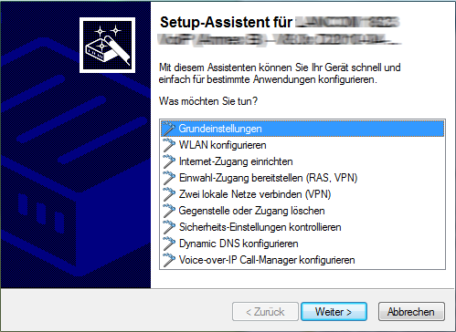 Starten Sie LANconfig, z. B. mit einem Doppelklick auf das Desktop-Symbol. LANconfig sucht nun automatisch im lokalen Netz nach Geräten. Wird dabei ein noch nicht konfiguriertes Gerät im lokalen Netz gefunden, startet LANconfig selbstständig den Setup-Assistenten.