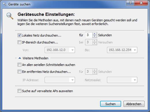 )oder rufen den Befehl über suchen auf. LANconfig erkundigt sich dann, wo es suchen soll. Um weitere Einstellung der Suche vorzunehmen, klicken Sie auf und wählen Menüpunkt Start aus.