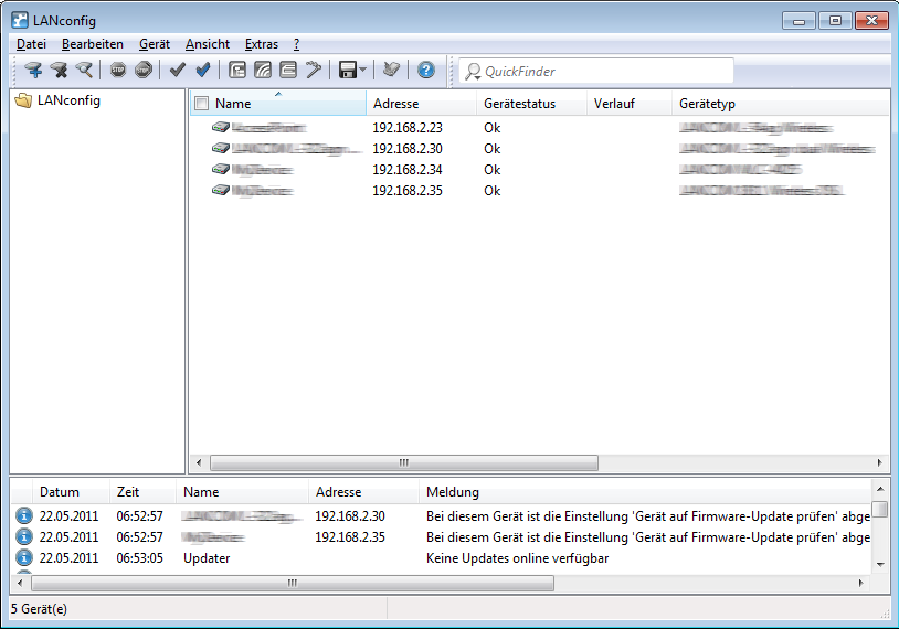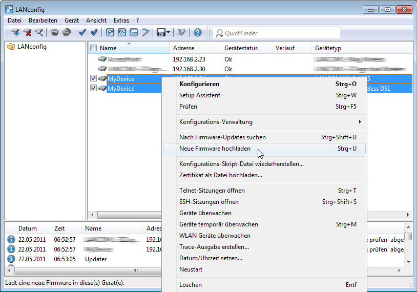 LANconfig führt dann alle Aktionen für die ausgewählten Geräte nacheinander durch. So können Sie z. B. gleichzeitg für mehrere Geräte neue Firmwares hochladen.