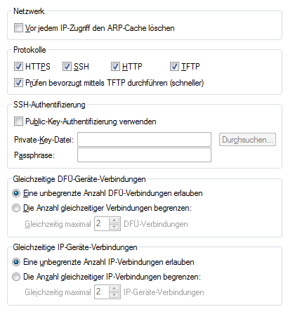 • HTTPS, SSH, HTTP, TFTPMit dieser Auswahl aktivieren Sie die einzelnen Protokolle für die Operationen Firmware-Upload sowie Konfigurations- und Script-Upload und -Download. Bei diesen Operationen versucht LANconfig, diese Protokolle in der Reihenfolge HTTPS, SSH, HTTP und TFTP zu verwenden. Schlägt die Übertragung mit einem der gewählten Protokolle fehl, versucht LANconfig automatisch das nächste Protokoll.
