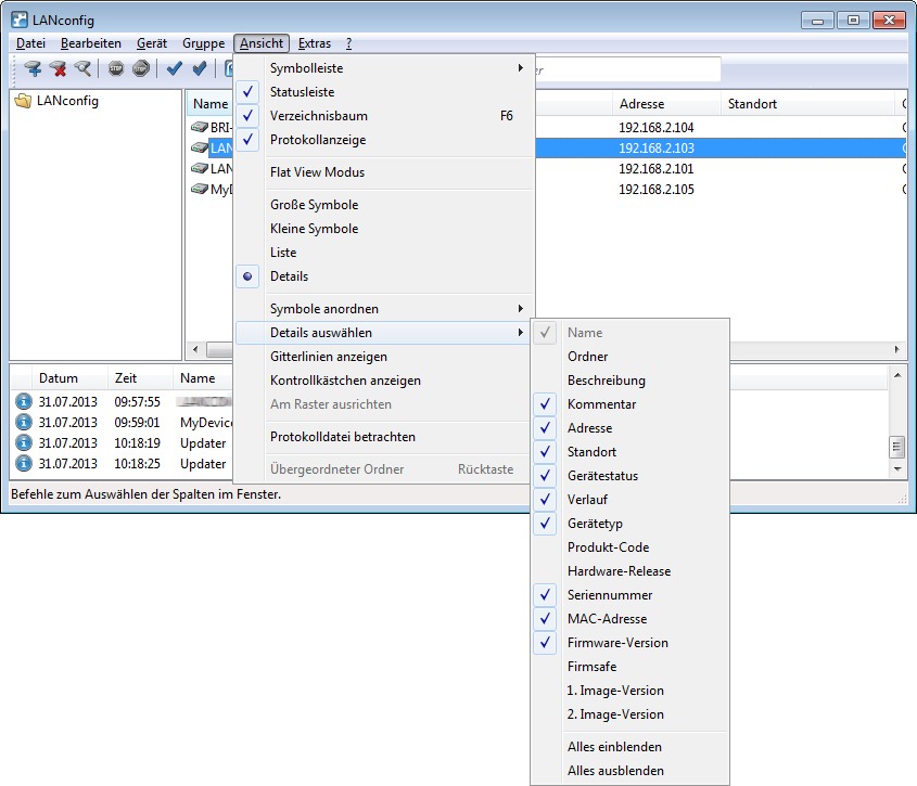 Für eine bessere und schnellere Übersicht und Orientierung auch in großen Projekten können in LANconfig die Spalten mit gerätebezogenen Informationen einzeln ein- bzw. ausgeblendet werden. Alternativ können Sie auch mit der rechten Maustaste auf die Spaltenüberschriften klicken und im sich öffnenden Kontextmenü das Menü unter aufrufen.